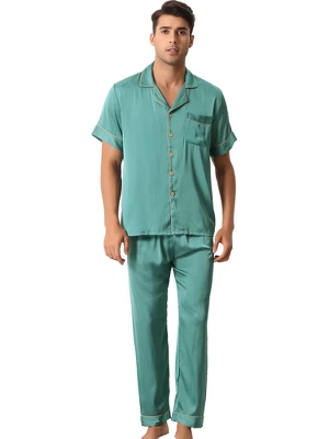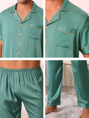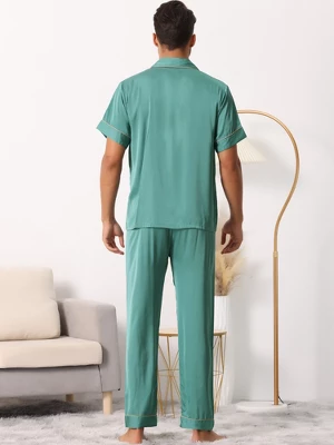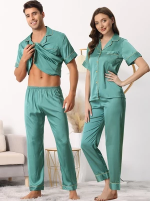 Cheibear Men’s Satin Sleepwear Short Sleeve Button Down T-Shirt With Pants Couple Pajama Set