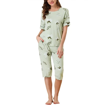 - Casual pajama top and matching capri pants. Soft pajama shirt features with round collar, short sleeves, and floral printed, Pants with Elastic Waist design
