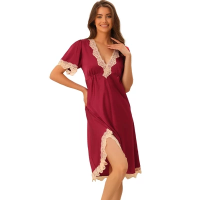 Cheibear Womens Satin Lace Trim V-Neck Lingerie Short Sleeves Silky Nightgowns