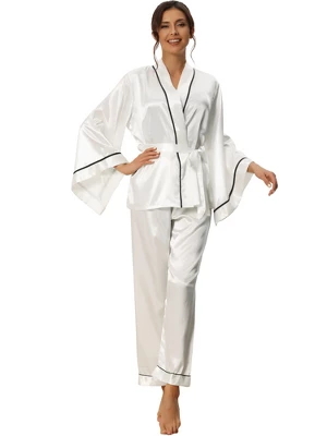 Great for loungewear, nightwear, sleepwear, home bedroom, and daily wear. This loungewear robe with pants for women is constructed of super smooth satin fabric, and comfy, bell sleeves with an adjustable self-tie outer belt, making it convenient to take on/off and keeping you pretty and comfortable all day. This pajama set is casual and classy style, even if guest visits suddenly, you won’t feel embarrassed, making your home life more convenient.No matter the cozy bedtime, simple home relaxation, laze afternoon, relaxing bath, the soft and lightweight sets could company with you all the time. This elegant set is perfect for slumber parties, pajama nights, or daily wear or as a holiday gift for Mother’s Day, Thanksgiving, Christmas, or birthday gifts.