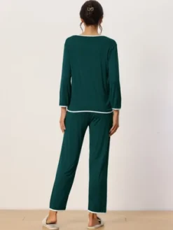 Cheibear Womens Sleepwear Soft Lace Trim Knit Stretch Long Sleeve Shirt And Pants 2pcs Pajama Set